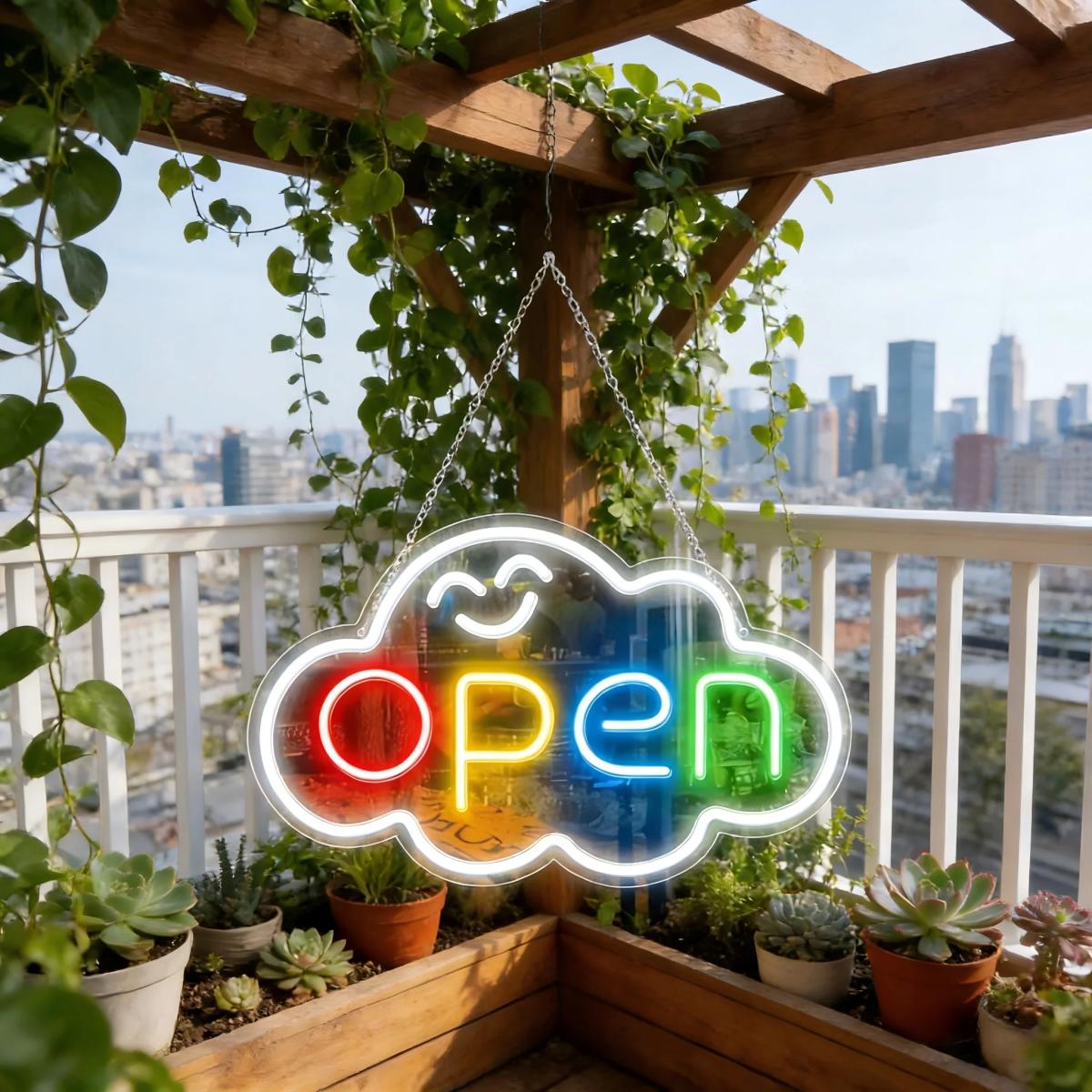 Δώσε στο μαγαζί σου (ή στον χώρο σου) την αίσθηση ότι “ανάβει ζωή” με το που μπαίνει κάποιος. Η φωτεινή πινακίδα LED νέον με τη λέξη OPEN και πολύχρωμο σχέδιο λειτουργεί σαν ξεκάθαρο σήμα ότι είσαι ανοιχτά, αλλά και σαν διακοσμητικό στοιχείο που κάνει τη βιτρίνα, τον τοίχο ή το παράθυρο να δείχνουν πιο σύγχρονα και φιλόξενα.