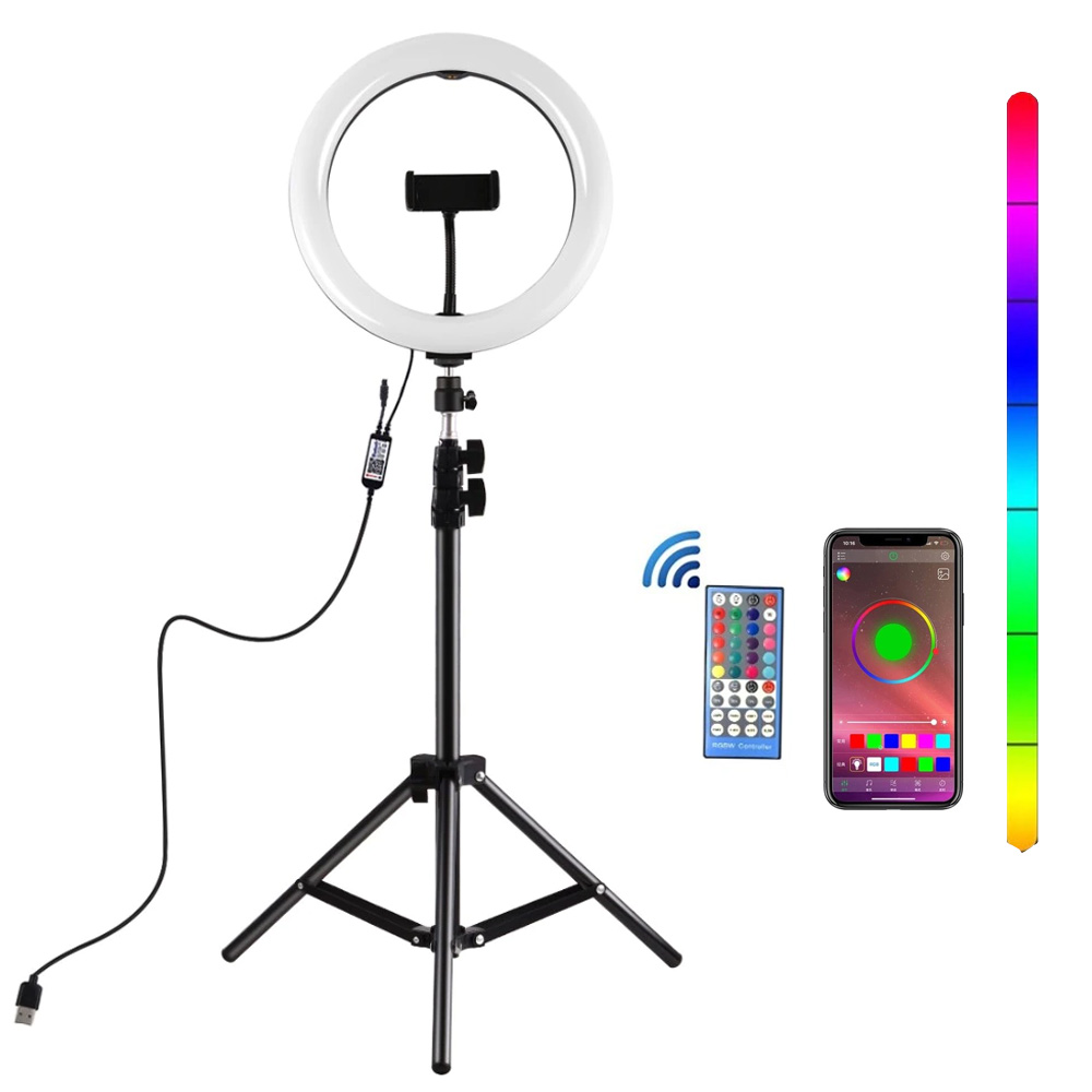 Φωτογραφικό Φωτιστικό Δαχτυλίδι RGB LED 26cm USB με Αpp Εφαρμογή, Τηλεχειριστήριο, Ρυθμιζόμενο Χρώμα Φωτισμού, Dimmer, Τρίποδο & Βάση Στήριξης Κινητού