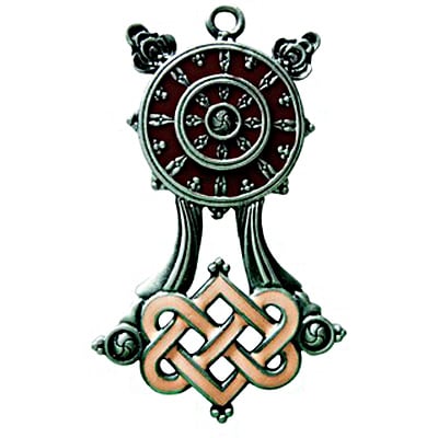 Το αρχαιότερο από τα Βουδιστικά σύμβολα, ο τροχός Dharmachakra με τις οκτώ ακτίνες στέκεται πάνω στον αέναο δεσμό και συμβολίζει όλη τη διδασκαλία του Βουδισμού.Μέγεθος (εκατ.) : 3,8Χ2,3