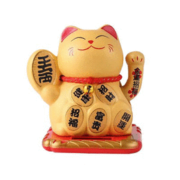 Η χαμογελαστή γάτα με το υπερυψωμένο πόδι προσελκύει πλούτο, καλή τύχη, ευημερία και καλωσορίζει στο χώρο σας φίλους ή νέα πελατεία (αν πρόκειται για χώρο εργασίας).
