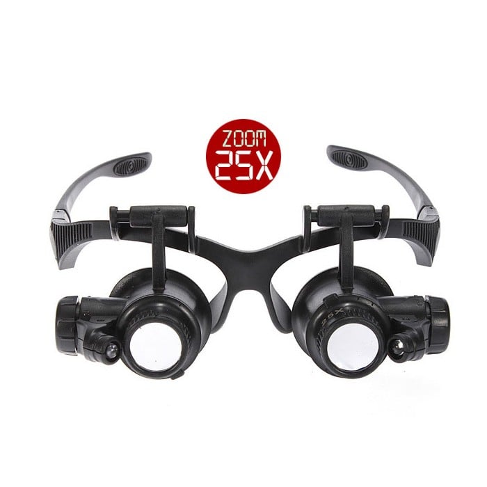 Γυαλιά - μεγεθυντικός φακός με δυνατότητα zoom 25x και φωτισμό με LED, πάνω σε σκελετό γυαλιών για ευκολία στη χρήση.