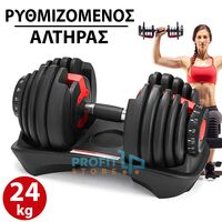 Καινοτόμο ρυθμιζόμενων κιλών βαράκι. Μόνο με ένα αλτήρα και τον πρωτοποριακό αυτό μηχανισμό, μπορείτε να έχετε όσα κιλά χρειάζεστε μόνο με μια απλή περιστροφική κίνηση! Πλήρη σειρά επιλογών βάρους από 2,5 έως 24 κιλά!