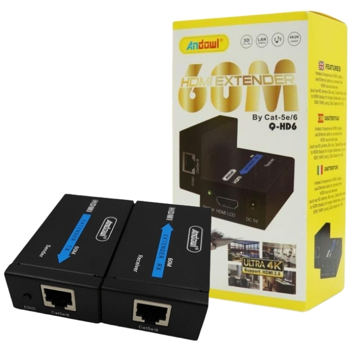 Ο HDMI Extender της Andowl προσφέρει αξιόπιστη και καθαρή μετάδοση εικόνας και ήχου μέσω καλωδίου δικτύου, επεκτείνοντας το HDMI σήμα έως και 60 μέτρα χωρίς απώλειες.
