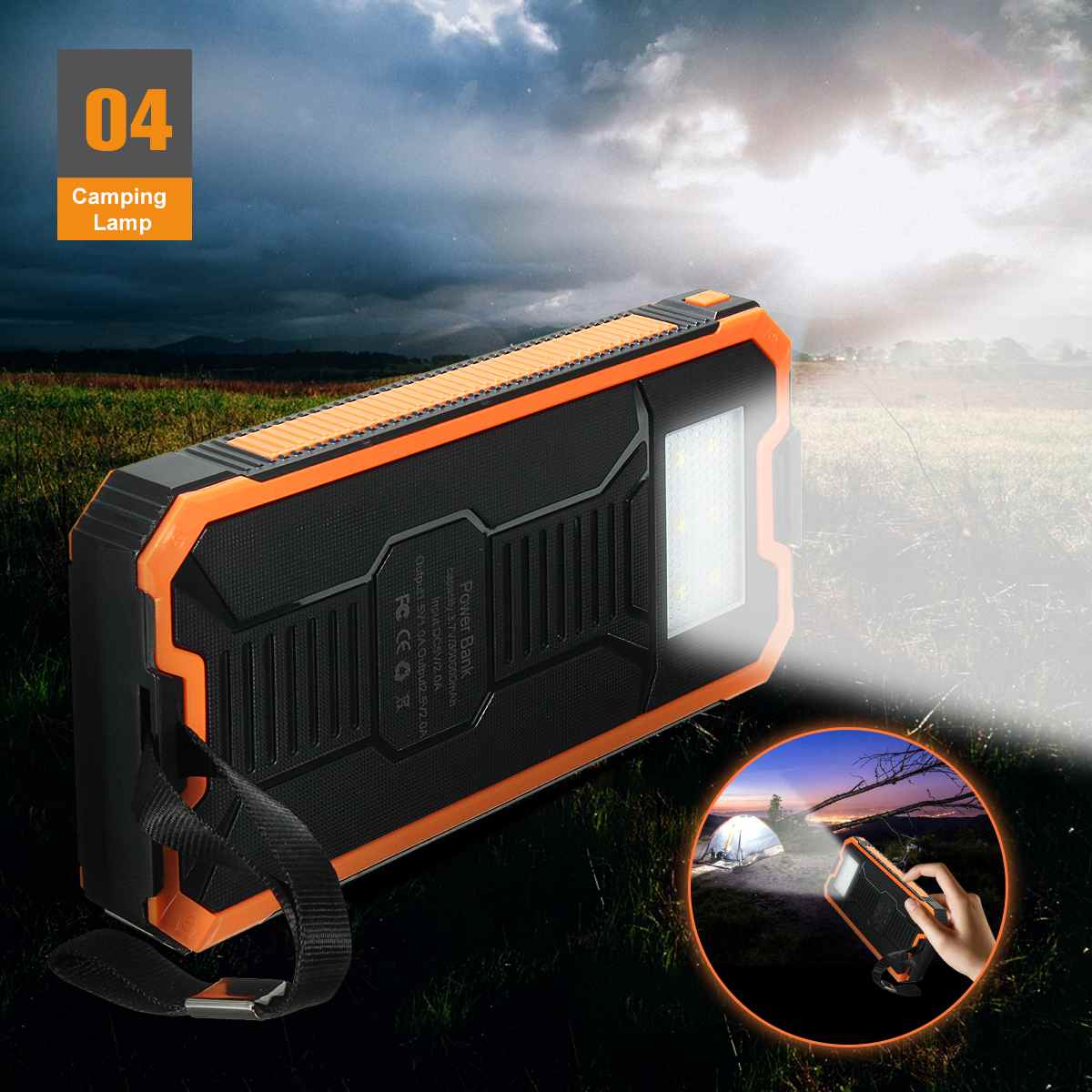 Heavy Duty Ηλιακό Powerbank & Φακός LED - Φορητή Μπαταρία Φορτιστής & Φωτιστικό Επιβίωσης με Ηλιακό Πάνελ Υψηλής Ισχύος 2A - Solar Power Bank Battery Charger Πορτοκαλί