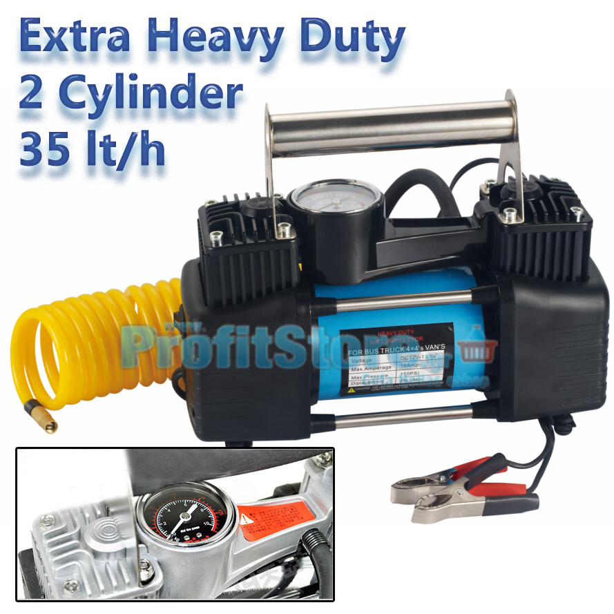 Heavy Duty Ηλεκτρική τρόμπα αυτοκινήτου μεγάλων απαιτήσεων 150 PSI. 2 κύλινδροι και ροή άερα 35 lt/h. Mεγάλη ισχύ και ανθεκτική μεταλλική κατασκευή. Ιδανική για μεγάλα οχήματα 4x4, αγροτικά, φορτηγά, τρακτέρ κλπ.