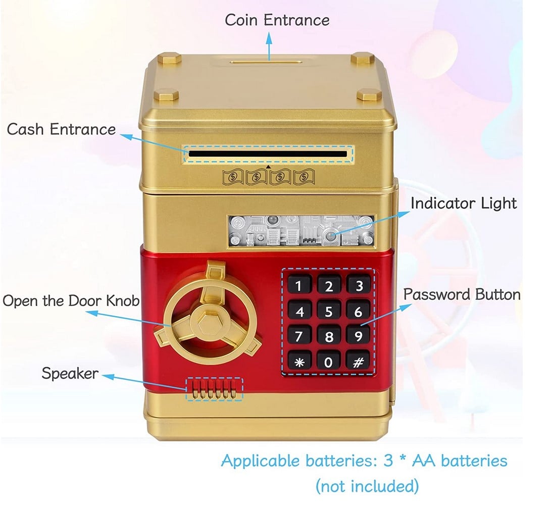 Ο Ηλεκτρονικός Κουμπαράς Χρηματοκιβώτιο με κωδικό ασφαλείας ανοίγει με ηλεκτρονικό συνδυασμό, οπότε μπορείτε κατά διαστήματα να μετράτε τις αποταμιεύσεις σας χωρίς να χρειάζεται να τον καταστρέψετε! Ιδανικό δώρο για τα παιδιά ώστε να μάθουν από μικρά την αξία της αποταμίευσης, με ευχάριστο τρόπο!