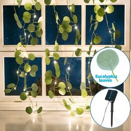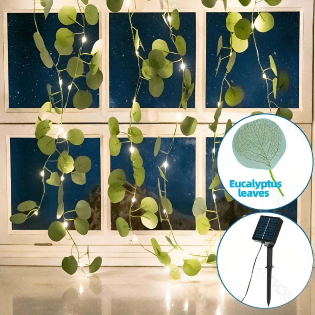 Δώστε έναν ατμοσφαιρικό, φυσικό χαρακτήρα στον χώρο σας με αυτά τα ηλιακά LED φώτα τύπου κουρτίνας, διακοσμημένα με ρεαλιστικά φύλλα ευκαλύπτου.