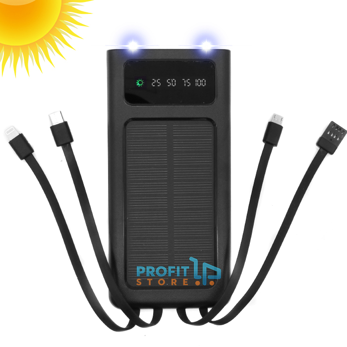 Ηλιακή Φορητή Μπαταρία Φόρτισης Συσκευών 30000mAh Powerbank με 4 Καλώδια Lightning, Micro USB, Type C, USB - Επαναφορτιζόμενο με Φακό, 2 x USB