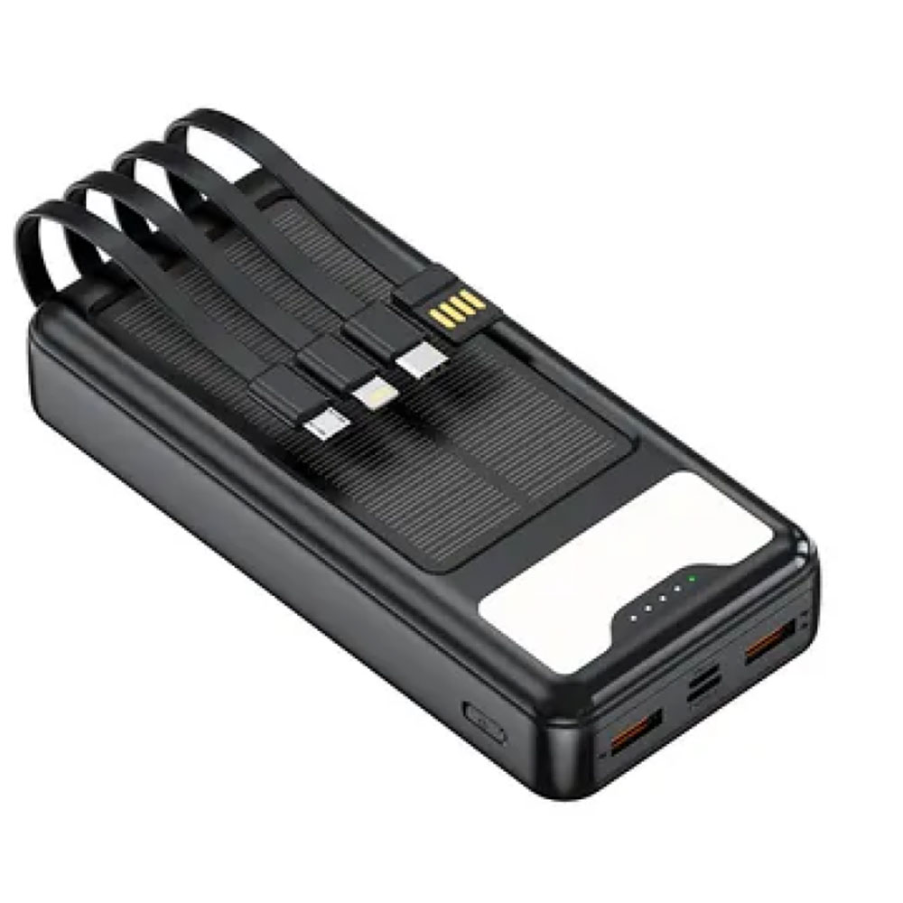 Ένα φορητό, ισχυρό power bank χωρητικότητας 12000 mAh, με ενσωματωμένο ηλιακό πάνελ και 4 ενσωματωμένα καλώδια φόρτισης (USB-C, Micro-USB, Lightning κ.λπ.), το οποίο σας επιτρέπει να φορτίζετε κινητά, tablet, ακουστικά ή άλλες συσκευές χωρίς να χρειάζεστε πρίζα.