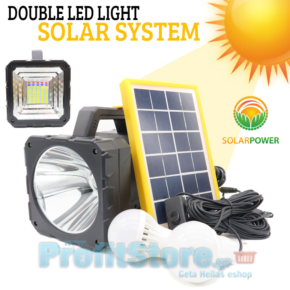 Ηλιακό Σύστημα Φωτισμού & Φόρτισης με Panel 3W, Μπαταρία Λιθίου, Ισχυρός Φακός - Προβολέας & Φωτιστικό, 2 Λάμπες LED 100W & Θύρα USB