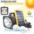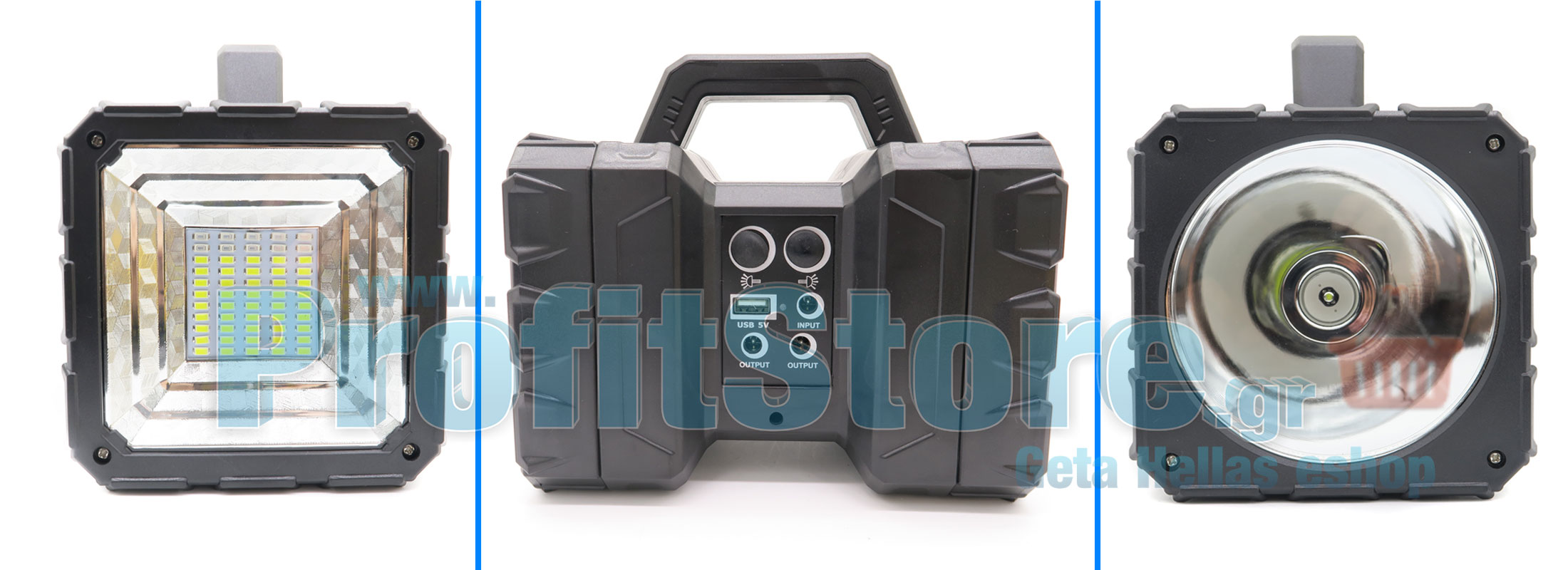 Πλήρες ηλιακό πακέτο φωτισμού με ηλιακό panel, μπαταρία λιθίου με ισχυρότατο φακό - προβολέα και φωτιστικό LED 500LM το κάθε ένα, LED SOS μπλέ - κόκκινο αναλάμπων φωτισμό αστυνομίας, θύρα USB για φόρτιση συσκευών, 2 λάμπες LED 100W μεγάλης φωτεινότητας 100LM.