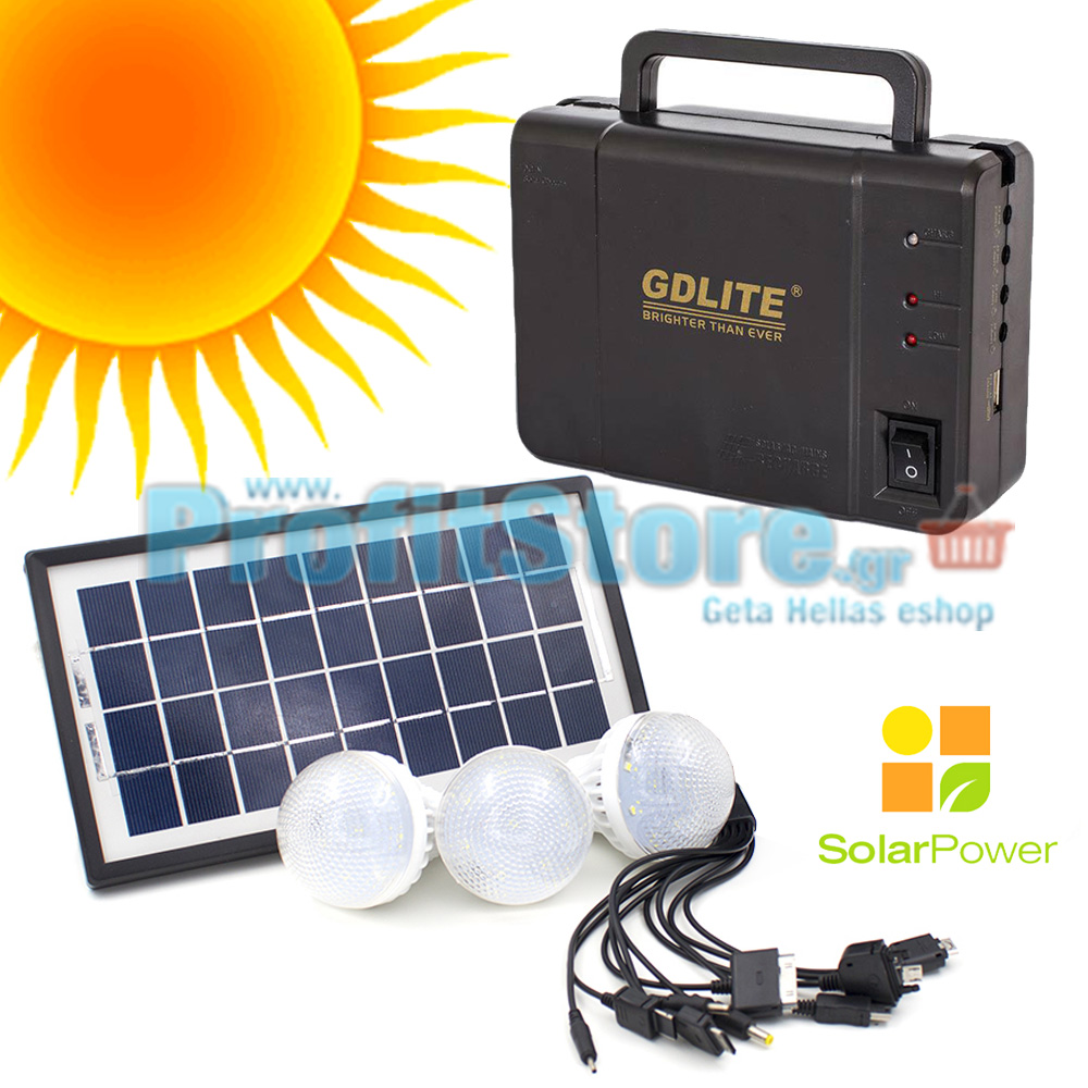 Ηλιακό Σύστημα Φωτισμού & Φόρτισης με Panel, Μπαταρία & 3 Λάμπες LED GDLITE+