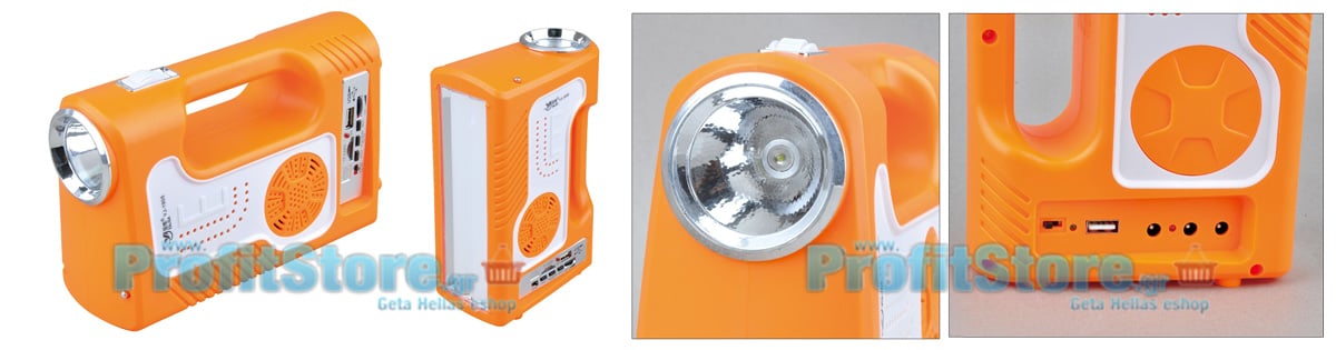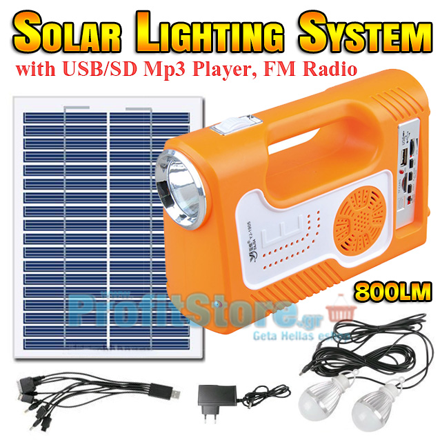 Πλήρες ηλιακό πακέτο φωτισμού με ηλιακό panel, μπαταρία με ισχυρότατο φακό και φωτιστικό LED, 200 και 400 Lumens, θύρα usb για φόρτιση συσκευών, 2 λάμπες led 100 Lumens, πλεξούδα usb με αντάπτορες για φόρτιση διαφορετικών συσκευών και κινητών τηλεφώνων και πλήρες USB/SD Mp3 Player καθώς και FM Ραδιόφωνο με δυνατό και καθαρό ήχο !
