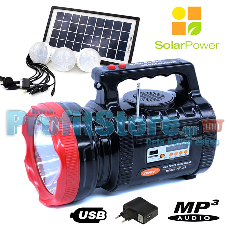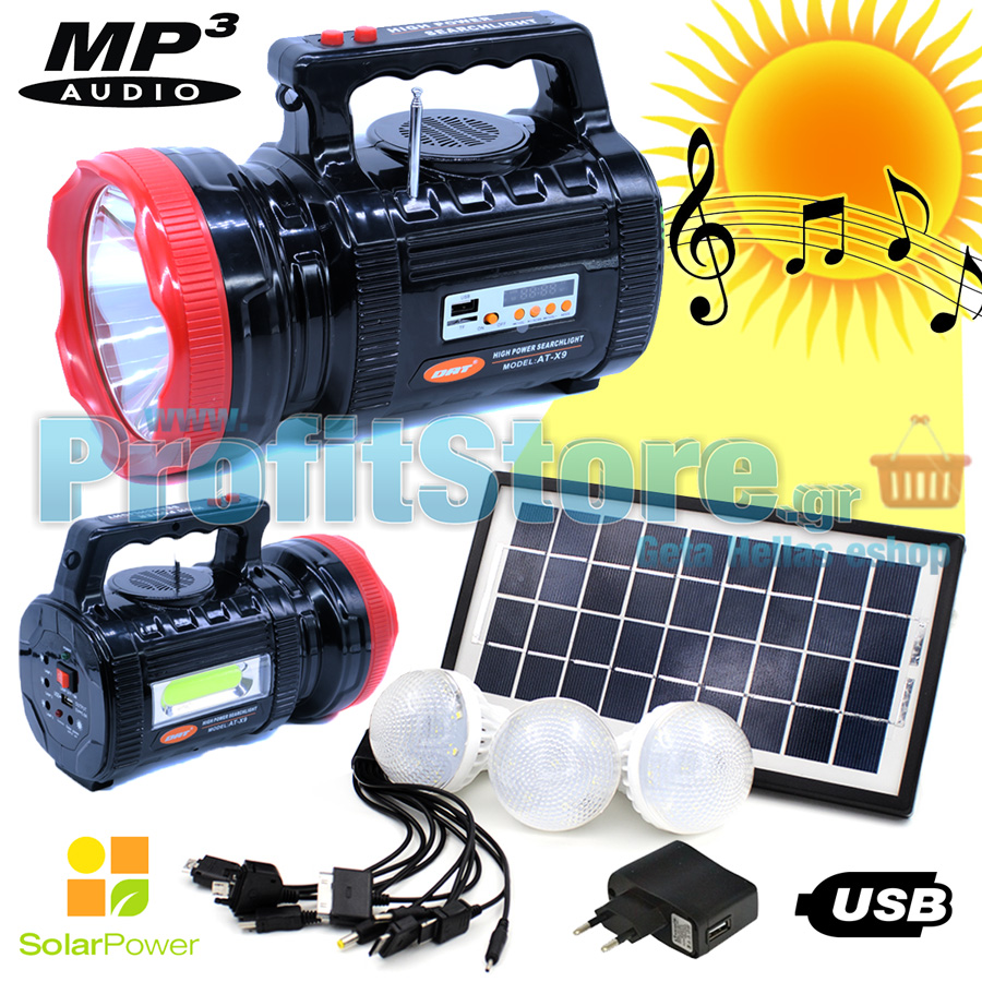 Ηλιακό Σύστημα Ήχου, Φωτισμού & Φόρτισης με Panel 3W, Μπαταρία, Ισχυρό Φακό 1000LM & Φωτιστικό, Ηχοσύστημα Mp3/USB/SD/FM Player & 3 Λάμπες LED