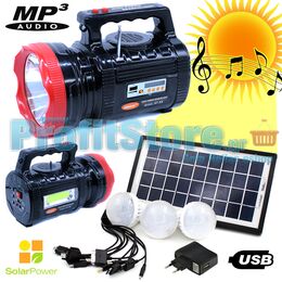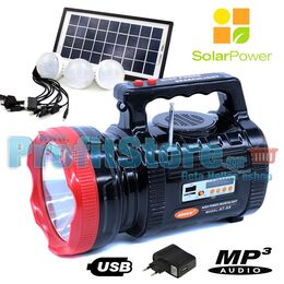 Ηλιακό Σύστημα Ήχου, Φωτισμού & Φόρτισης με Ισχυρό Φακό 1000LM & Φωτιστικό, Ηχοσύστημα Mp3,USB,SD,FM Player, Panel 3W, Μπαταρία & 3 Λάμπες LED