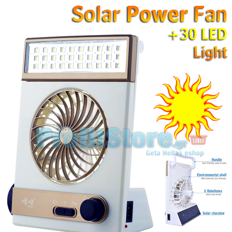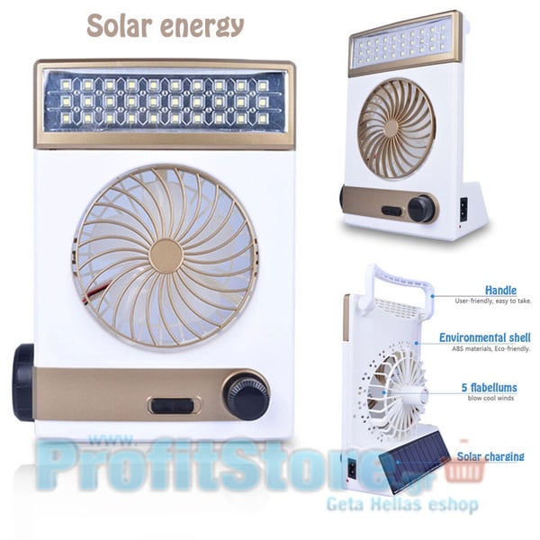 Ηλιακός Φορητός Επαναφορτιζόμενος Ανεμιστήρας 10εκ με Φακό & Φωτιστικό LED