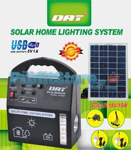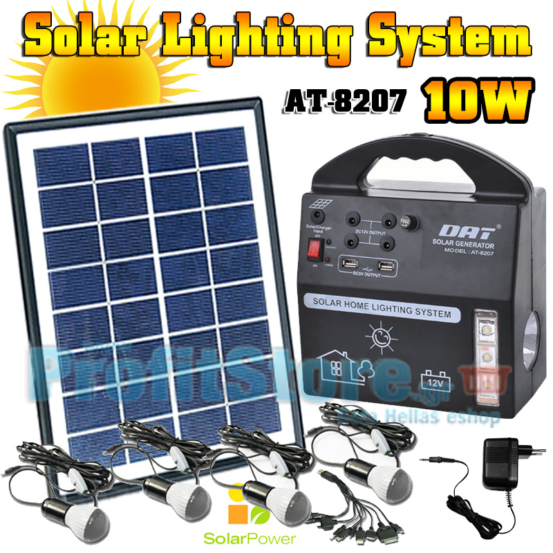 Ισχυρό Ηλιακό Πακέτο Φωτισμού με Panel 10W, Μπαταρία, Θύρες USB και 4 Λάμπες Led 5W, DAT AT-8207