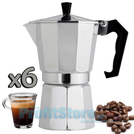 Καφετιέρα Εσπρεσσο για 6 φλυτζάνια. Κατάλληλη για εστία και γκάζι. Με βαλβίδα Ασφαλείας.