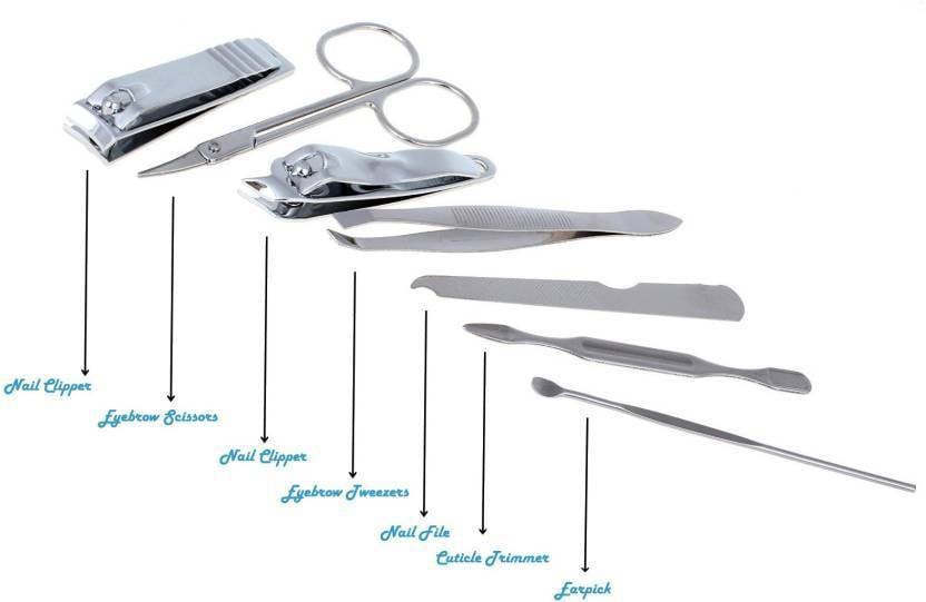 - Nail Cutter, Nail Clipper, Tweezers, Scissor, Nail Filer, Ear Cleaner, Cuticle Pusher