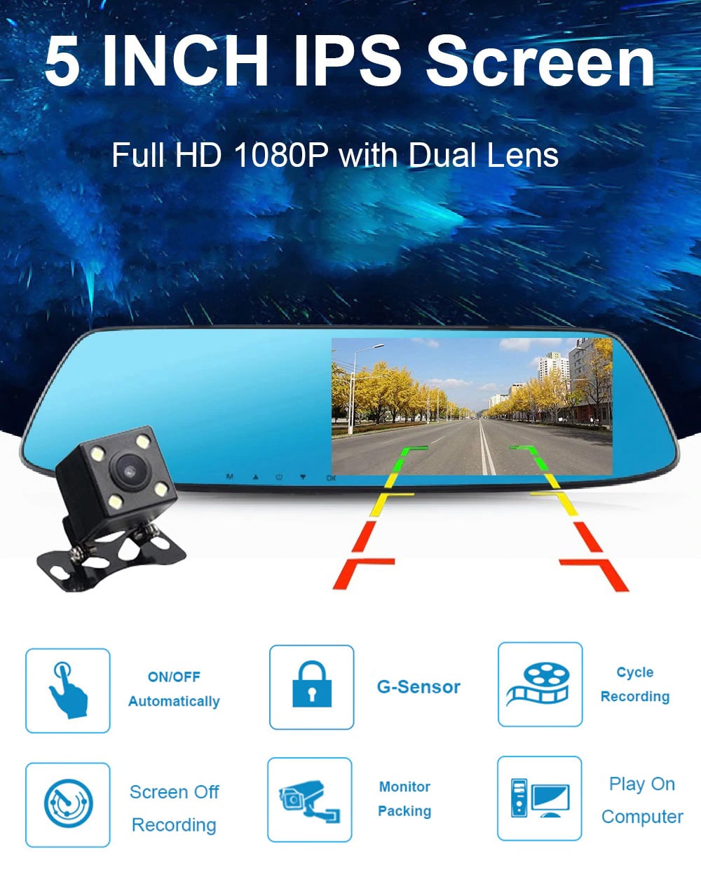 Αυτός ο καθρέπτης με κάμερα διαθέτει μεγάλη και ευδιάκριτη οθόνη 4,9 inch και πολλές λειτουργίες όπως Ανιχνευτή Κίνησης, G sensor και παρακολούθηση στάθμευσης.