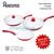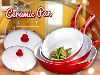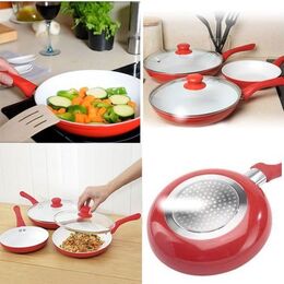Κεραμικά τηγάνια κόκκινου χρώματος με αντικολλητική επίστρωση χωρίς τα χημικά PTFE και PFOA, που απελευθερώνουν τοξικές ουσίες στο φαγητό, επικίνδυνες για την υγεία.