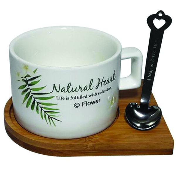 Κεραμική Κούπα 220ml με Φυσικό Ξύλινο Πιατάκι - Σουβέρ και Ανοξείδωτο Κουτάλι Minimal 8.2 x 5.6cm