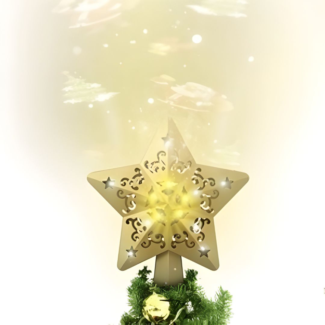 Η κορυφή-αστέρι με ενσωματωμένο προτζέκτορα συνδυάζει παραδοσιακή λάμψη με τεχνολογία φωτισμού, δημιουργώντας μια ονειρική ατμόσφαιρα στο χώρο.