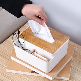 Θήκη για χαρτομαντηλα από πλαστικό και ξύλινο bamboo καπάκι, για να δώσετε μία ακόμα πιο όμορφη νότα στον χώρο σας! Μία όμορφη βάση για χαρτομάντιλα με θήκες οργάνωσης, για να έχετε όλα σας τα πράγματα τακτοποιημένα και όμορφα διαχωρισμένα.