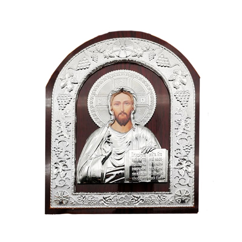 Ξύλινη Εικόνα Λουστραρισμένη που απεικονίζει τον Ιησού Χριστό, για οποιονδήποτε επιθυμεί να κοσμίσει τον χώρο του με αυτή την εξαιρετική λεπτομερή εικόνα. Η εικόνα είναι διακοσμημένη με ασημένιο πλαίσιο, με σχήμα που ξεκινάει ως ορθογώνιο και καταλήγει στην κορυφή ως ελλειπτικό.