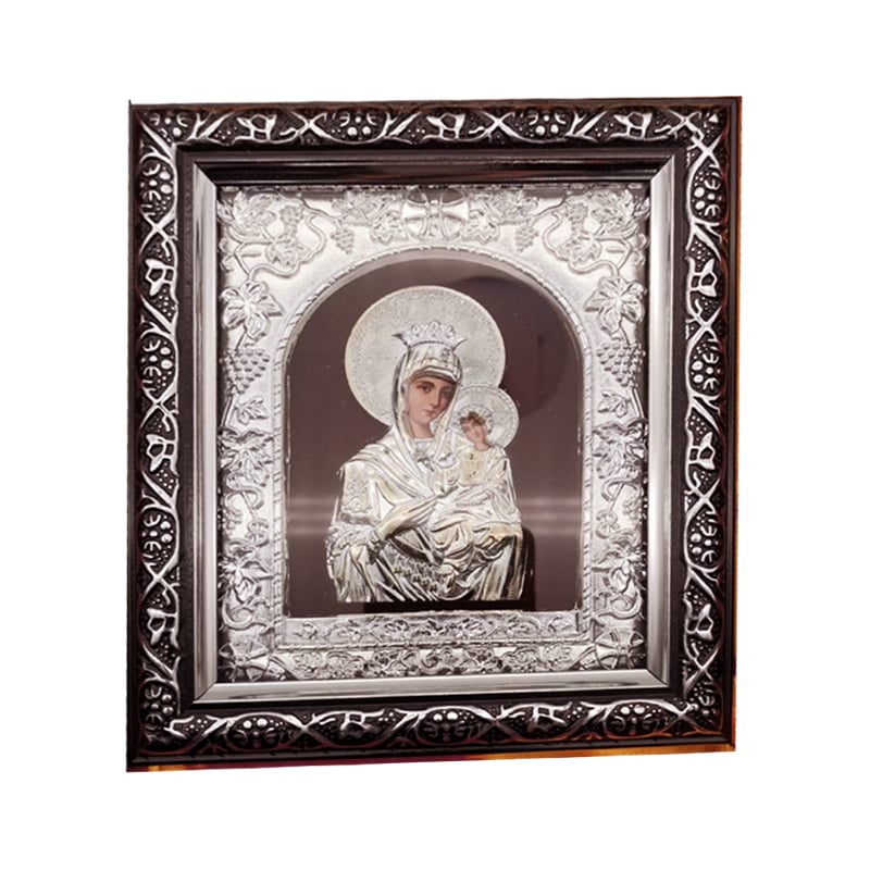 Ξύλινη Εικόνα Λουστραρισμένη που απεικονίζει την Παναγία με τον Ιησού Χριστό, για οποιονδήποτε επιθυμεί να κοσμίσει τον χώρο του με αυτή την εξαιρετική λεπτομερή εικόνα. Η εικόνα είναι διακοσμημένη με ασημένιο πλαίσιο, με σχήμα ορθογώνιο.