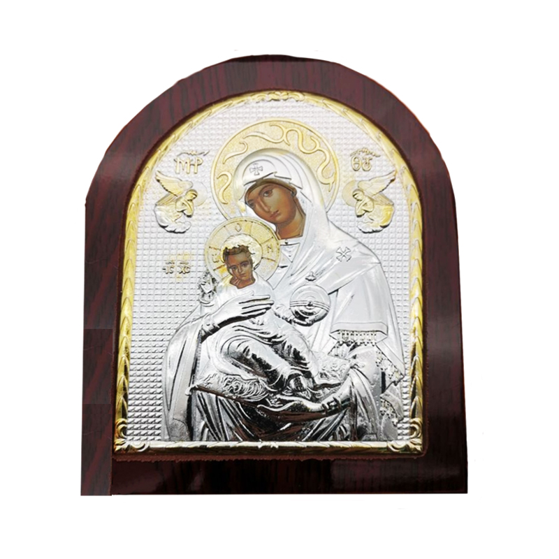 Ξύλινη Εικόνα Λουστραρισμένη που απεικονίζει την Παναγία με τον Ιησού Χριστό, για οποιονδήποτε επιθυμεί να κοσμίσει τον χώρο του με αυτή την εξαιρετική λεπτομερή εικόνα. Η εικόνα είναι διακοσμημένη με ασημένιο πλαίσιο, με σχήμα που ξεκινάει με τετράγωνη πλευρά και καταλήγει στη κορυφή ως ελλειπτική.
