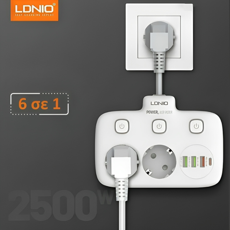 LDNIO 6 σε 1 Πολύπριζο 2 Θέσεων με Διακόπτες ON/OFF και 3 USB-A & USB-C - Intelligent Power Strip