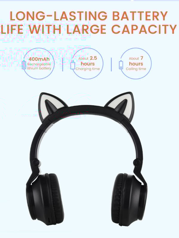 Φορητά ακουστικά με αυτάκια γάτας που φωτίζουν πολύχρωμα με LED, συνδέονται μέσω bluetooth ή καλωδίου 3,5mm με το κινητό, το τάμπλετ ή το PC σας για να απολαύσετε την αγαπημένη σας μουσική όπου κι αν βρίσκεστε!