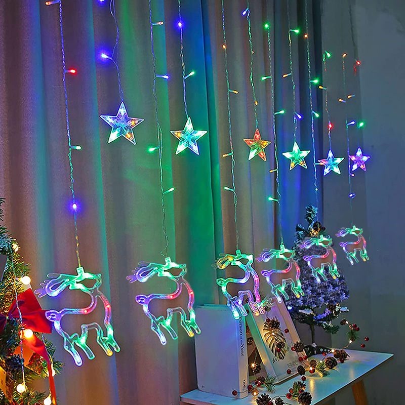 Στολίστε πρωτοποριακά τον χώρο σας με αυτή την πανέμορφη κουρτίνα - γιρλάντα με Χριστουγεννιάτικα λαμπάκια και σχήματα αστεριών και ελαφιών με εντυπωσιακό πολύχρωμο φωτισμό (RGB).