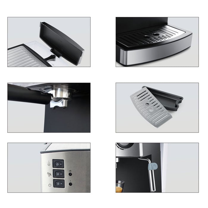 - Διαθέτει τρεις διακόπτες: ενεργοποίησης/ απενεργοποίησης, λειτουργία espresso και ζεστό νερό, παραγωγή ατμού