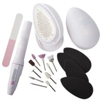 Pedi Mate για Μανικιούρ & Πεντικιούρ - Σετ 18 Τεμαχίων. Περιλαμβάνει τα παρακάτω 18 τεμάχια: Ένα ηλεκτροκίνητο ακροφύσιο για να προσαρμόζονται οι διάφορες κεφαλές για την περιποίηση των νυχιών (Οι μπαταρίες δεν περιλαμβάνονται). Δύο δοχεία για την απομάκρυνση και καθαρισμό του ξηρού/νεκρού δέρματος.