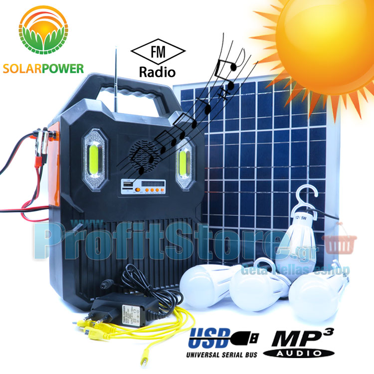 Μεγάλο Ηλιακό Σύστημα Φωτισμού, Ήχου & Φόρτισης με Πάνελ 10W, Μπαταρία, Φωτιστικό & SOS + 2 Λάμπες LED 150 Lumens - Mp3/USB/SD/FM Player
