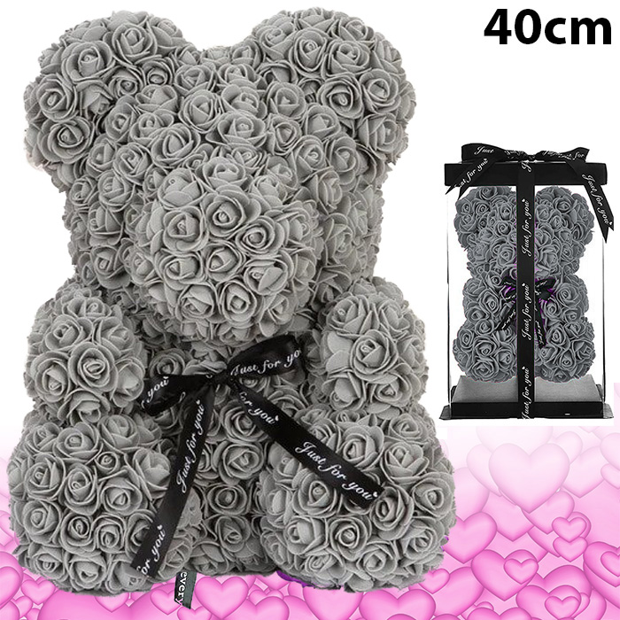 Μεγάλο Τριανταφυλλένιο Αρκουδάκι με Φιόγκο 40cm Σε Συσκευασία Δώρου - Δώρο για Άγιο Βαλεντίνο - Τεχνητά Ροδοπέταλα Τριαντάφυλλα Γκρι