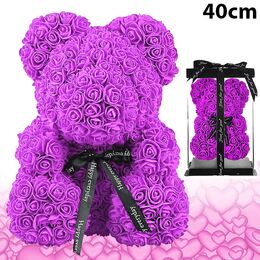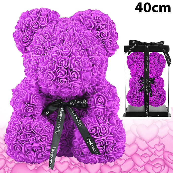 Μεγάλο Τριανταφυλλένιο Αρκουδάκι με Φιόγκο 40cm Σε Συσκευασία Δώρου - Δώρο για Άγιο Βαλεντίνο - Τεχνητά Ροδοπέταλα Τριαντάφυλλα Μωβ