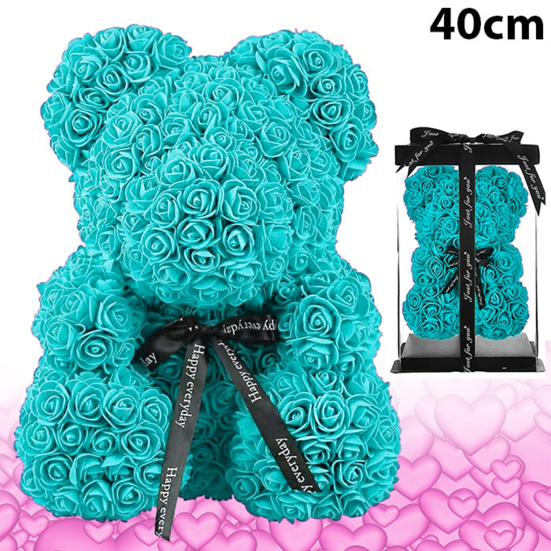 Μεγάλο Τριανταφυλλένιο Αρκουδάκι με Φιόγκο 40cm Σε Συσκευασία Δώρου - Δώρο για Άγιο Βαλεντίνο - Τεχνητά Ροδοπέταλα Τριαντάφυλλα Τιρκουάζ