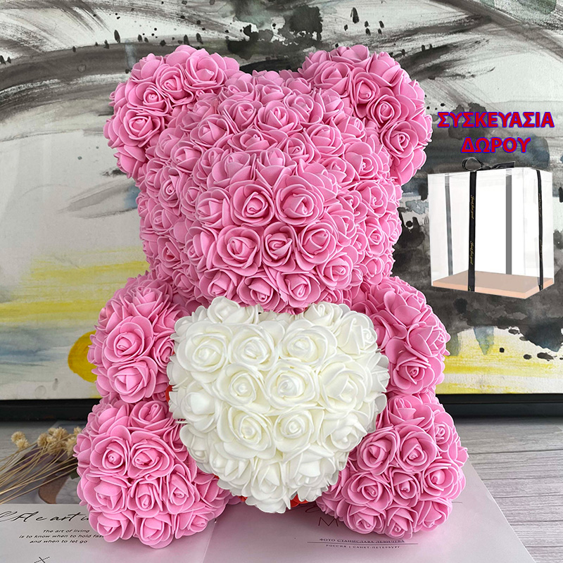 Μεγάλο Τριανταφυλλένιο Αρκουδάκι με Καρδούλα 40cm Σε Συσκευασία Δώρου - Δώρο για Άγιο Βαλεντίνο - Τεχνητά Ροδοπέταλα Τριαντάφυλλα Ροζ