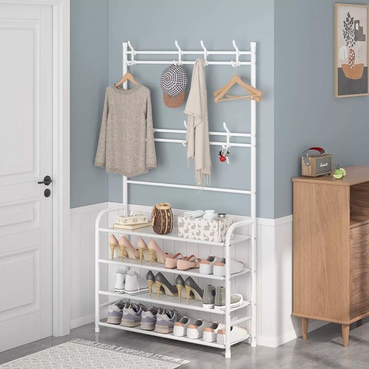 Δεν αποθηκεύει μόνο τα παπούτσια σας, όπως κάθε κοινή παπουτσοθήκη, αλλά σας δίνει τη δυνατότητα να κρεμάσετε τα καπέλα σας, τις τσάντες σας, τα πανωφόρια σας, τις ομπρέλες σας και ό,τι μικροαντικείμενο