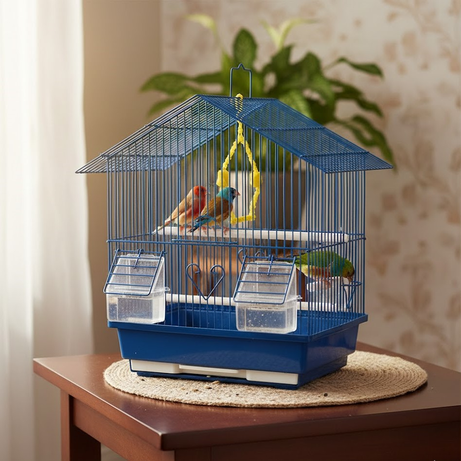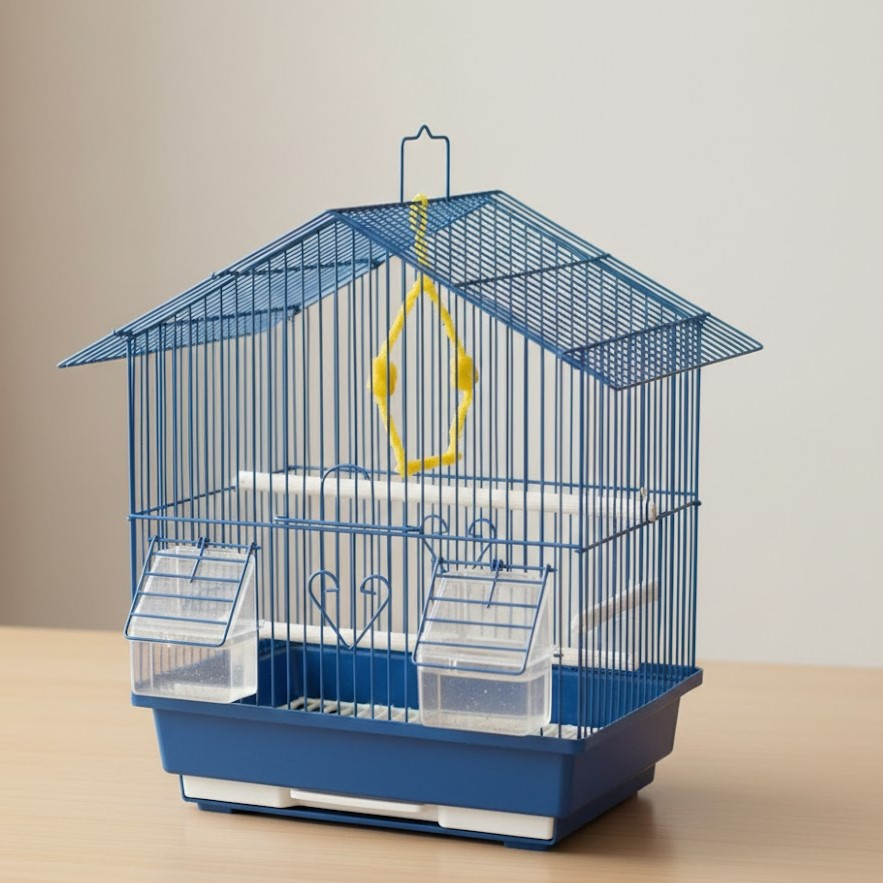 Το μεταλλικό κλουβί πτηνών σε μπλε απόχρωση συνδυάζει ανθεκτική κατασκευή και πρακτικό σχεδιασμό, προσφέροντας έναν ασφαλή χώρο φιλοξενίας για καναρίνια και μικρά πτηνά.