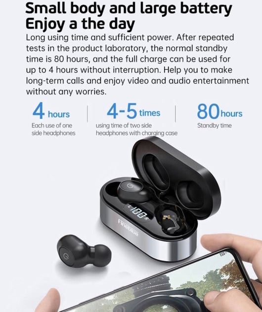 - Battery specifications: rechargeable polymer lithium battery 35mAh, charging box battery 300mAh battery