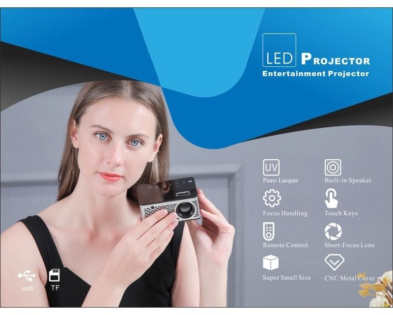 Με αυτόν τον φορητό προβολέα mini led μπορείτε να μετατρέψετε το δωμάτιο σας ή οποιοδήποτε άλλο χώρο σε Home Cinema. Συνδέετε με κάθε συσκευή εικόνας και ήχου καθώς και με τον υπολογιστή σας, ενώ λειτουργεί και αυτόνομα αναπαράγοντας περιεχόμενο από USB sticks και κάρτες μνήμης SD.