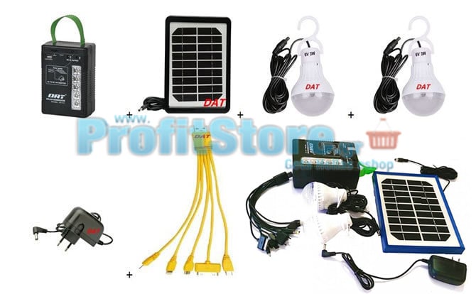 Πλήρες ηλιακό πακέτο φωτισμού μικρών διαστάσεων με ηλιακό panel, μπαταρία με φωτιστικό LED και θύρα usb για φόρτιση συσκευών, 2 λάμπες led 100LM και πλεξούδα usb με αντάπτορες για φόρτιση διαφορετικών συσκευών και κινητών τηλεφώνων.