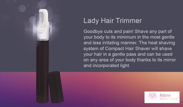 Το Adore Compact Hair Trimmer είναι ένα mini φορητό σύστημα για την ελάττωση της πυκνότητας της τριχοφυΐας στις δύσκολες περιοχές. Με την ολοκλήρωση της θεραπείας εξαφανίζεται το 80% των τριχών ενώ αδυνατίζουν οι υπόλοιπες. Τα αποτελέσματα είναι ορατά από τους πρώτους μήνες χρήσης.