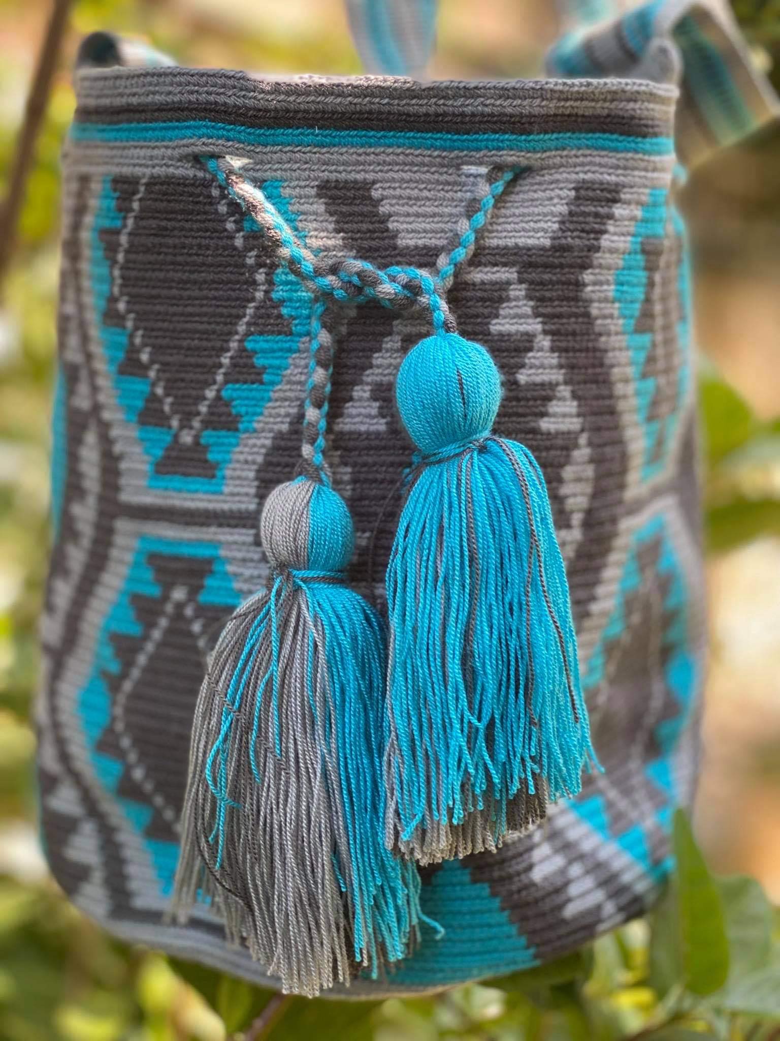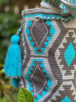 Μία και μοναδική wayuu mochila πλεγμένη με ντόπιες κλωστές και ζωηρά χρώματα από την αυθεντική κουλτούρα των Κολομβιανών εκτάσεων. Η συγκεκριμένη wayuu mochila διατίθεται σε ντόπιο γαλάζιο με γκρί χρώμα και σε γεωμετρικό σχέδιο με ρόμβους. Διαλέξτε τη δική σας. Την ΜΟΝΑΔΙΚΗ δική σας!