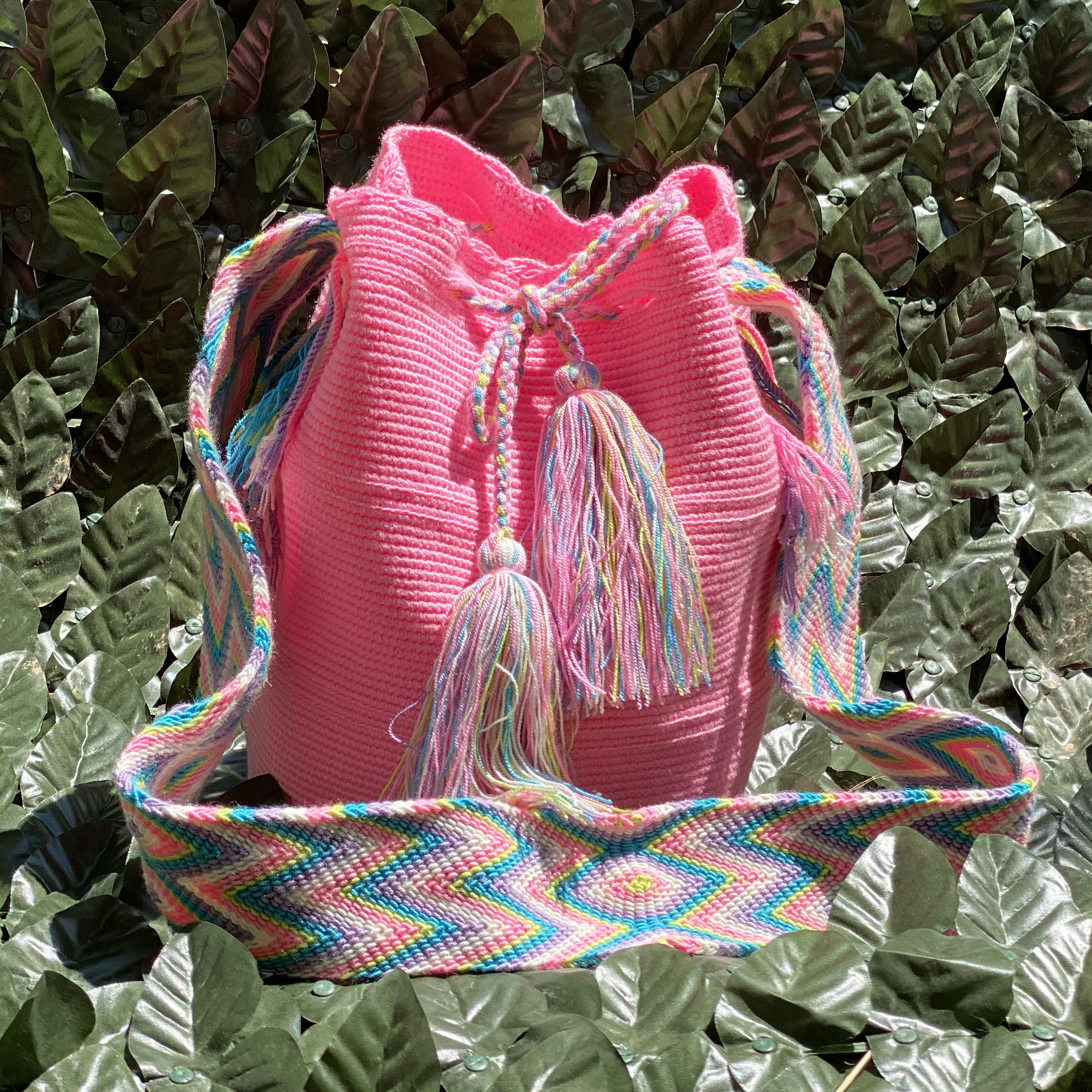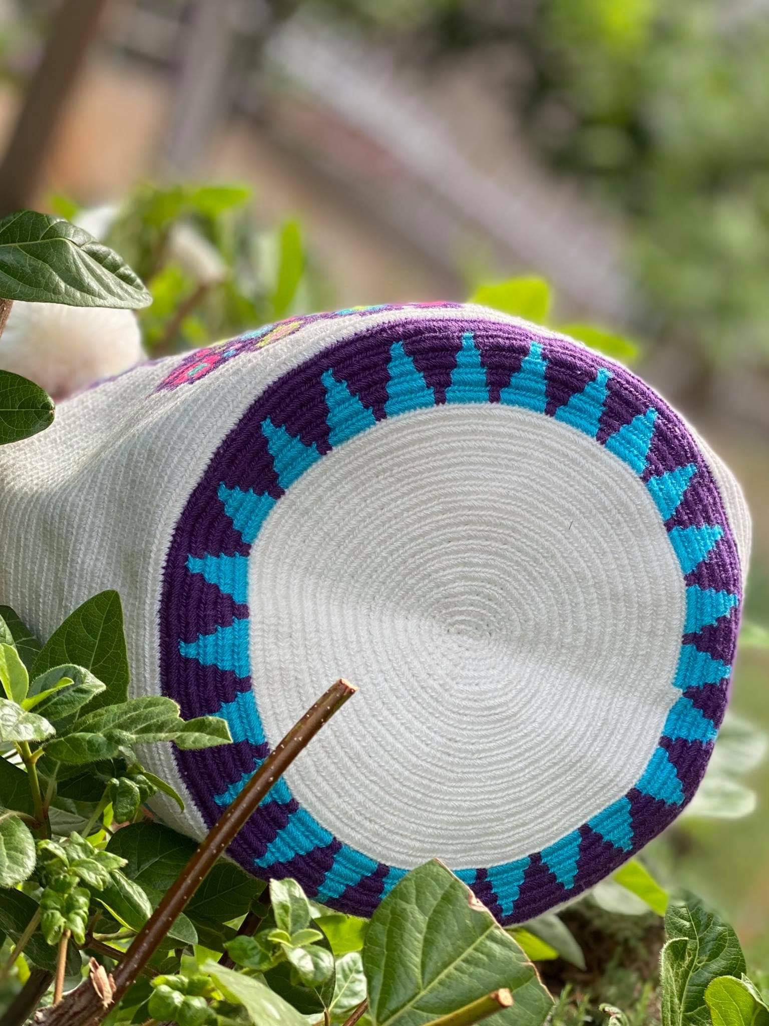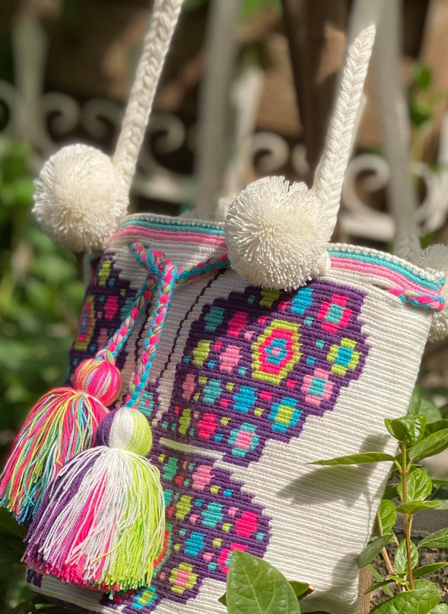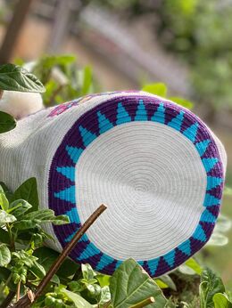 Μία και μοναδική wayuu mochila πλεγμένη με ντόπιες κλωστές και ζωηρά χρώματα από την αυθεντική κουλτούρα των Κολομβιανών εκτάσεων. Η συγκεκριμένη wayuu mochila διατίθεται σε λευκό χρώμα με ένα μοναδικό σχέδιο μωβ πεταλούδας με υπέροχα χρώματα του γαλαζιου, του ροζ, του φυσικού πράσιινου. Διαλέξτε τη δική σας. Τη ΜΟΝΑΔΙΚΗ δική σας!