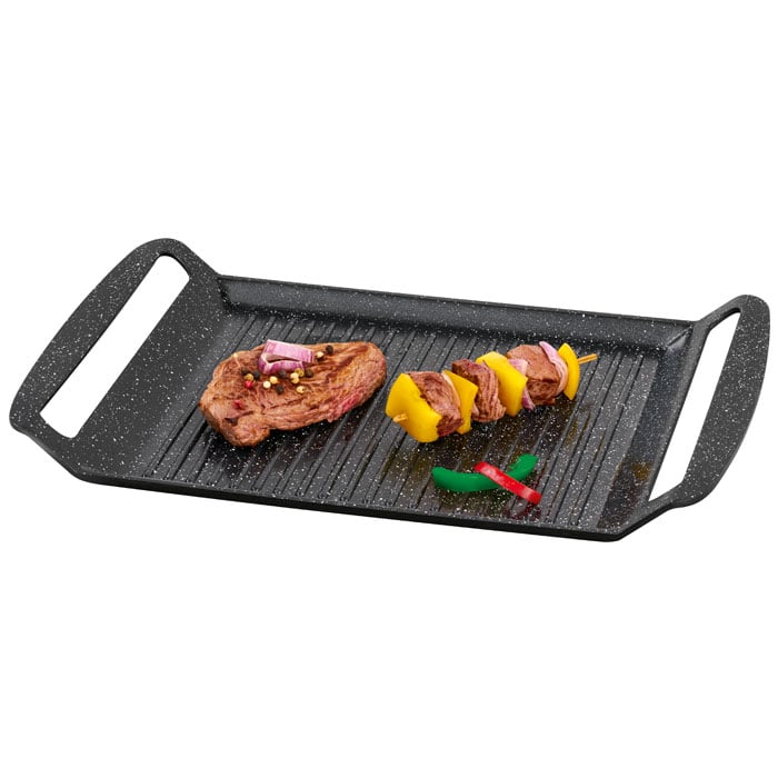 - Πλάκα από αλουμίνιο με κεραμική επίστρωση, κατάλληλο για επαγωγικές εστίες, με εξαιρετικά βαθιές αυλακώσεις για βέλτιστη απορροή του λίπους